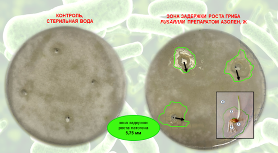 При проведении лабораторных испытаниях было выявлено, что препарат задерживает развитие гриба Fusarium (рис.3), поэтому с уверенностью можно сказать, что штамм бактерий Azotobacter vinelandii обладает не только азотфиксирующими свойствами, но и способен подавлять фузариоз.